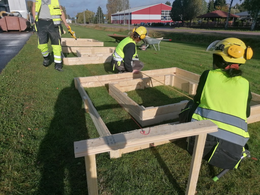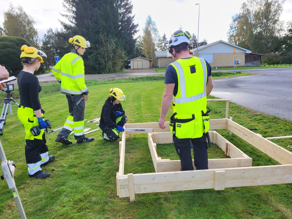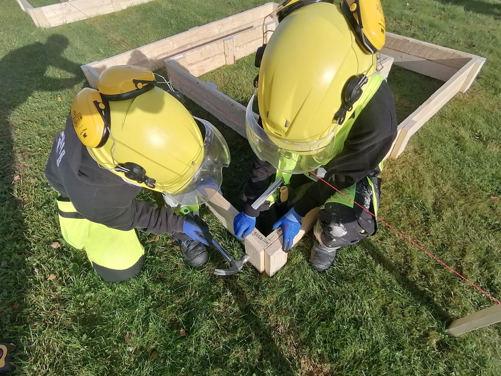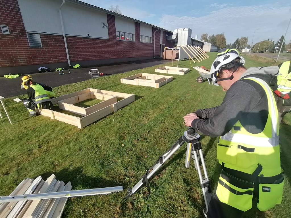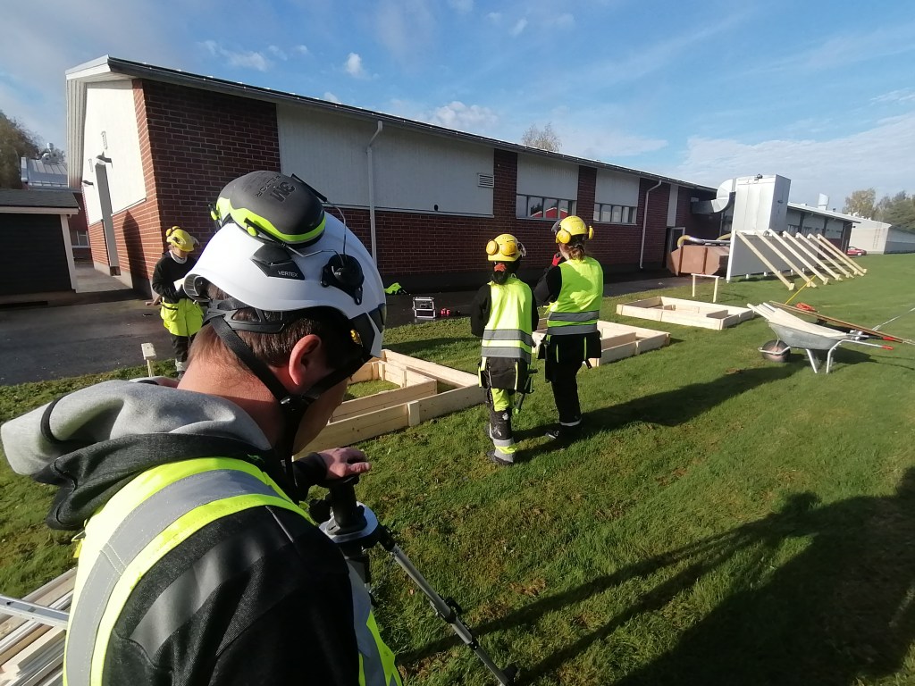 Harjoitustöitä Sataedun piha-alueella à la rakennusalan 1. vuoden opiskelijat.