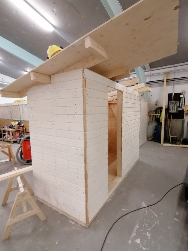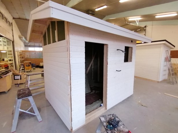 Tänä syksynä pienempiä varastorakennuksia, roskakatoksia, postilaatikkotelineitä ja koirankoppeja on valmistunut, kuin liukuhihnalta. Asiakas- ja tilaustöitä on ollut runsaasti ja tänään muutama opiskelija tekee myös ennakkovalmisteluja tuleviin rakennusalan 9-päiviin.