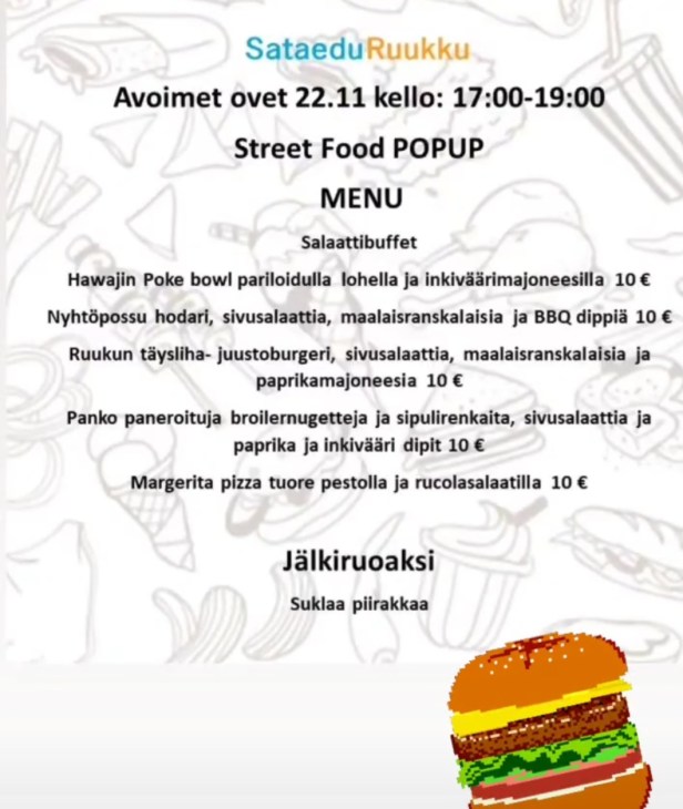 Opetusravintola Ruukku auki teemalla Street Food. Ruokalista ja hinnat yllä olevassa kuvakarusellissa, katso kuva 12.