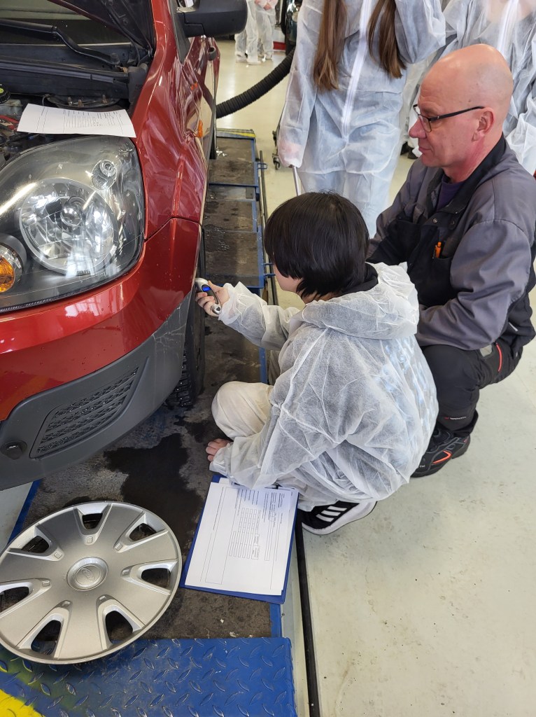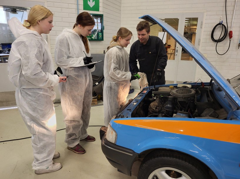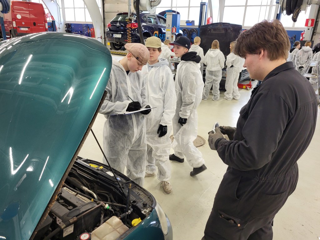 8-luokkalaisia ohjasivat Sataedun automekaanikko-opiskelijat ja ajoneuvoalan opettaja Rami Kantola.