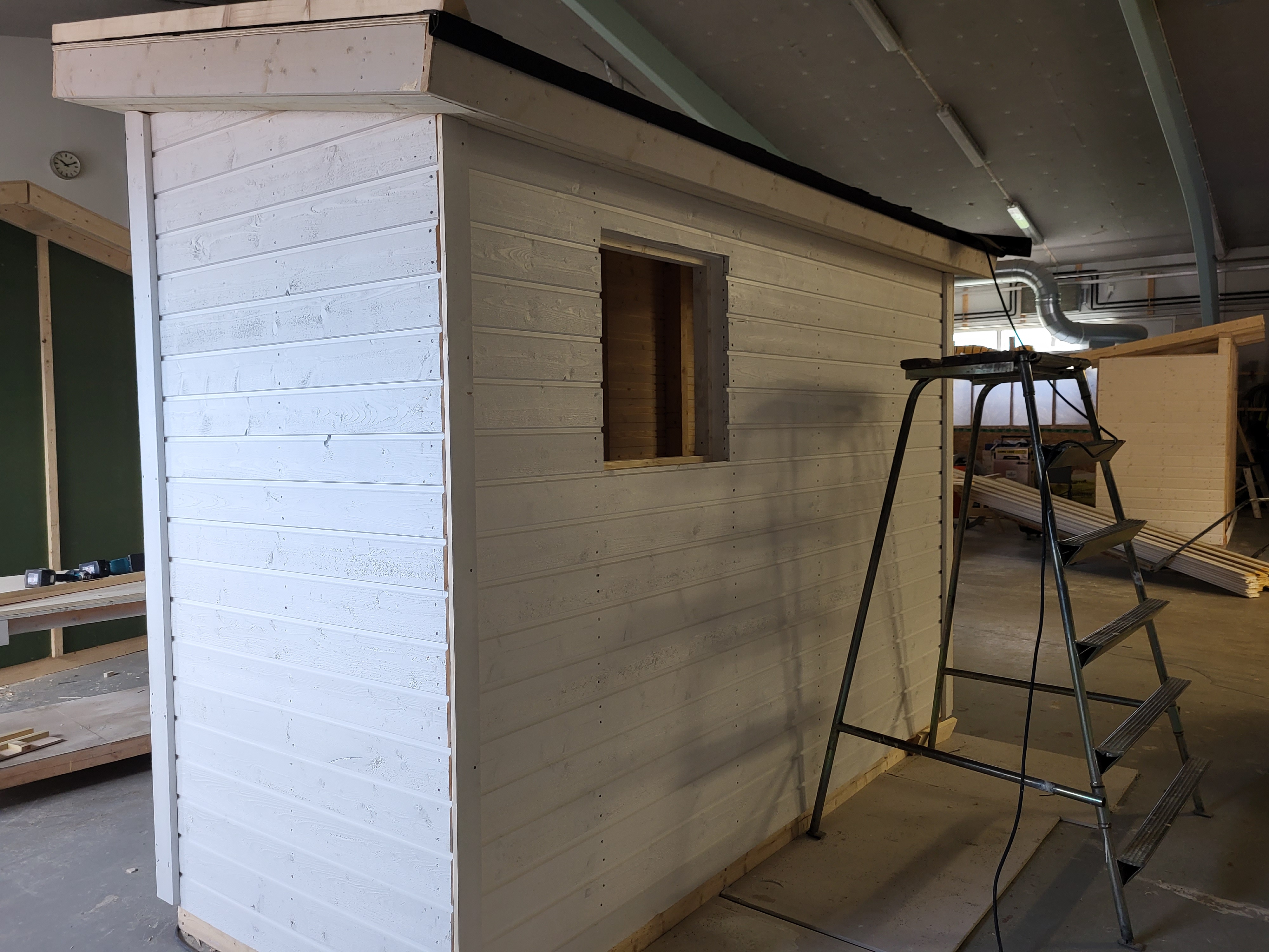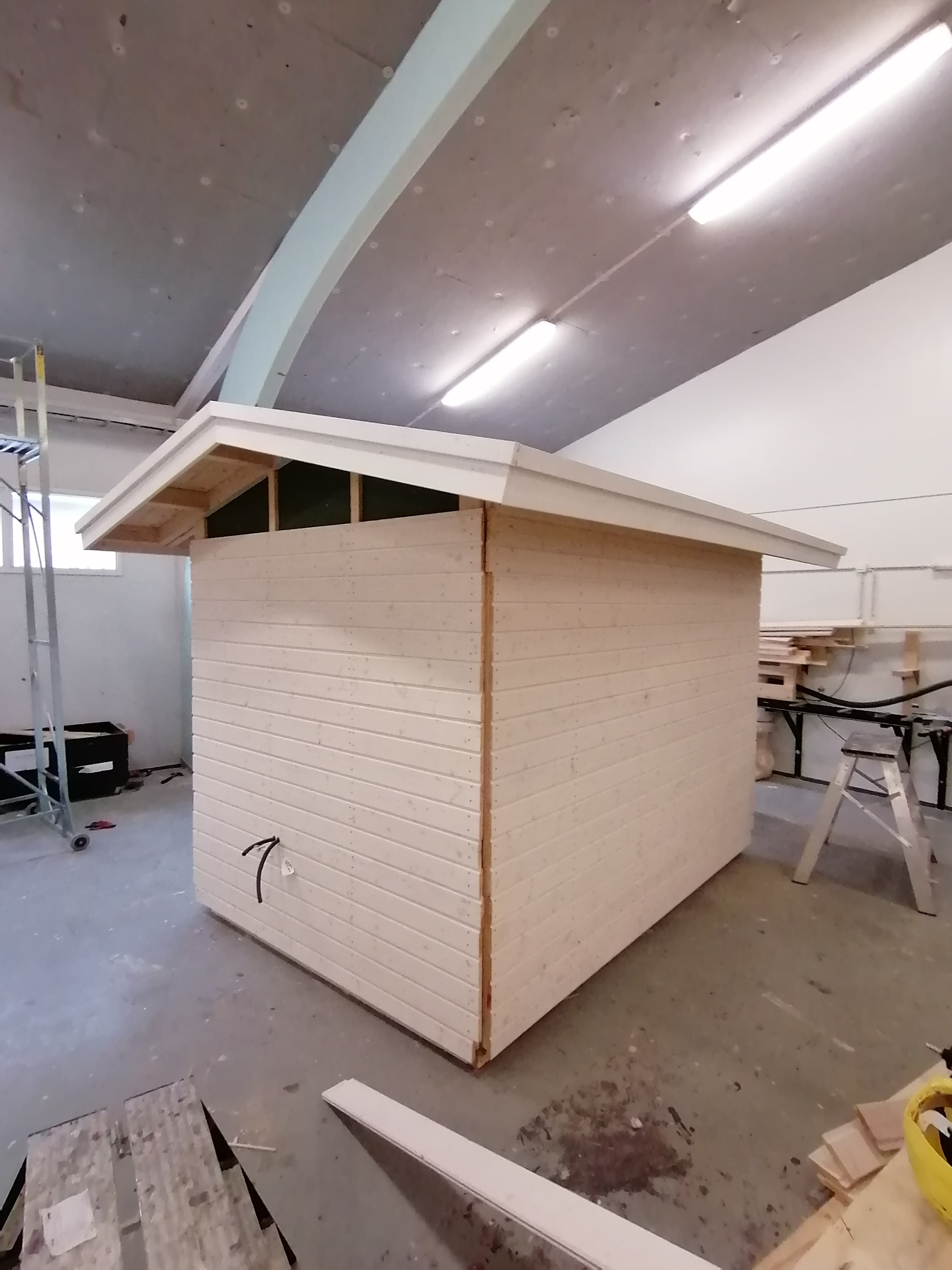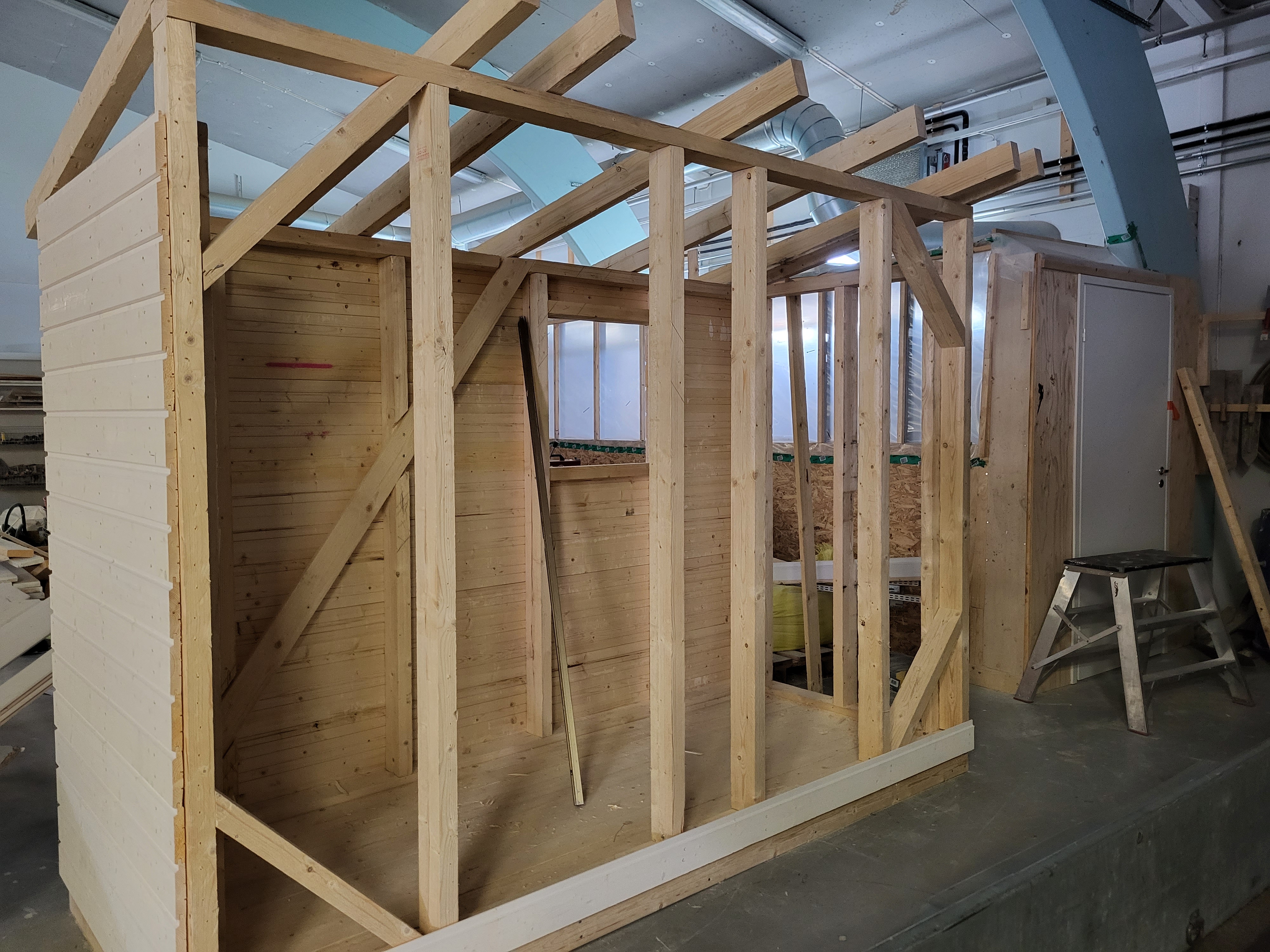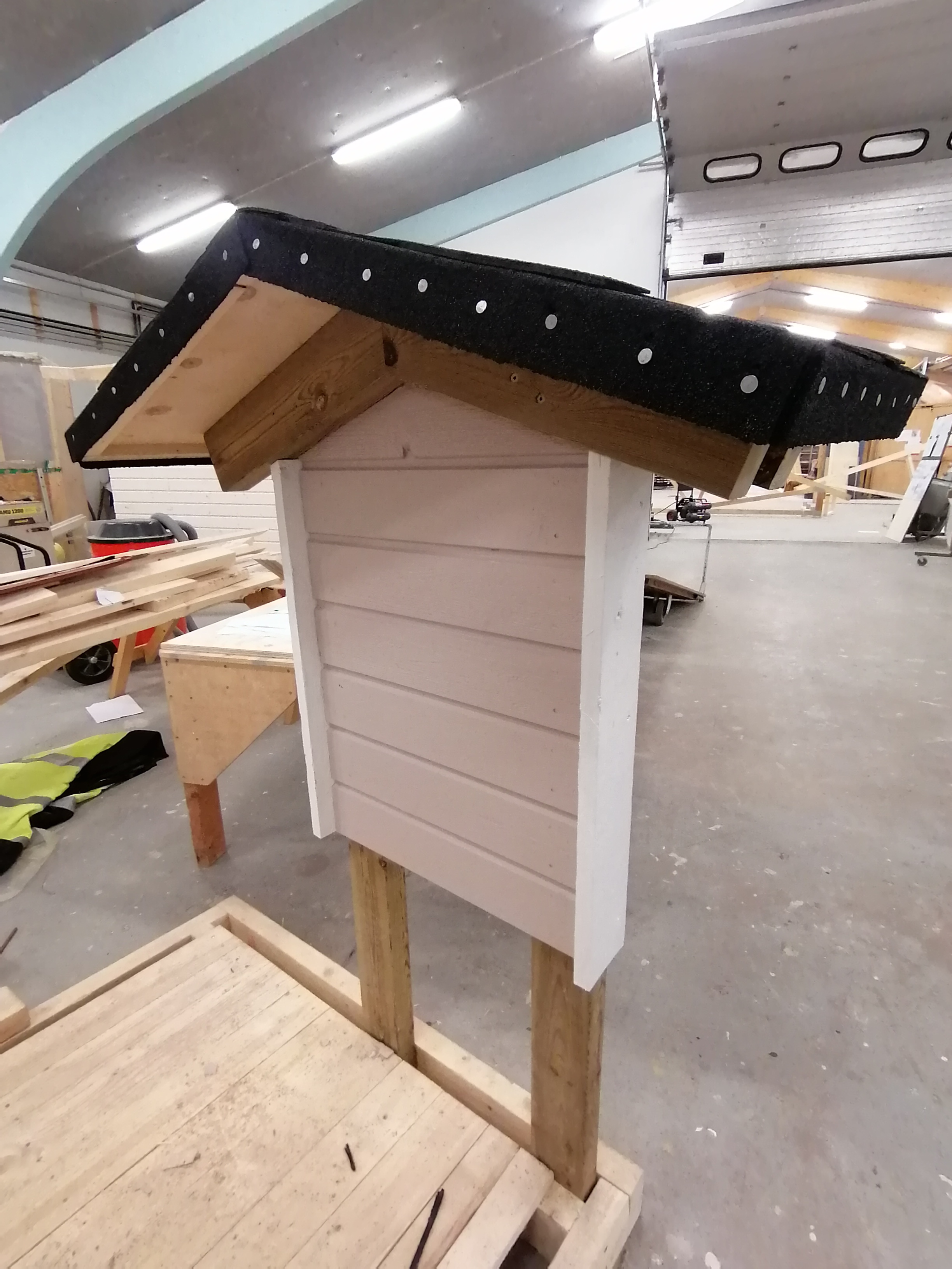 Varastoja, sauna, leikkimökki, roskakatoksia, koirankoppi, metsästäjien kyttäyskoppeja ja postilaatikkotelineitä.