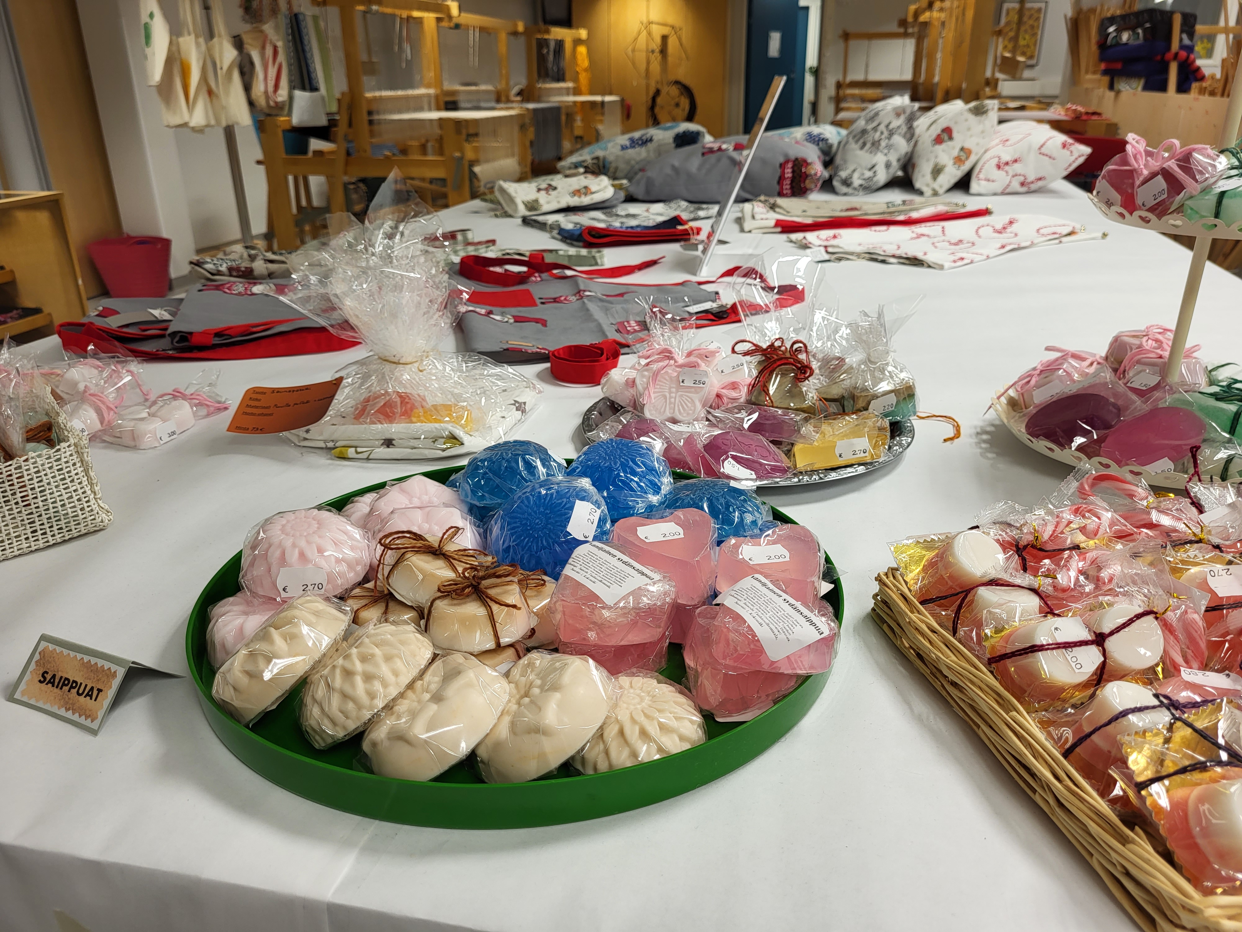 Mattojen, verhojen, korujen, vaatteiden, saippuan, kynttilän, seinävaatteiden valmistusta jne. Myynnissä myös kangaspuita. Lisäksi artesaaniopiskelijat valmistavat erilaisiin juhliin ja tilaisuuksiin somisteita ja koristeita. Artesaaniopiskelijat ovat jo vuosia tehneet yhteistyötä muun muassa Porin Jazzin kanssa. Yhteistyössä on valmistunut Porin Kirjurinluodon jazz-aiheiset koristelut.